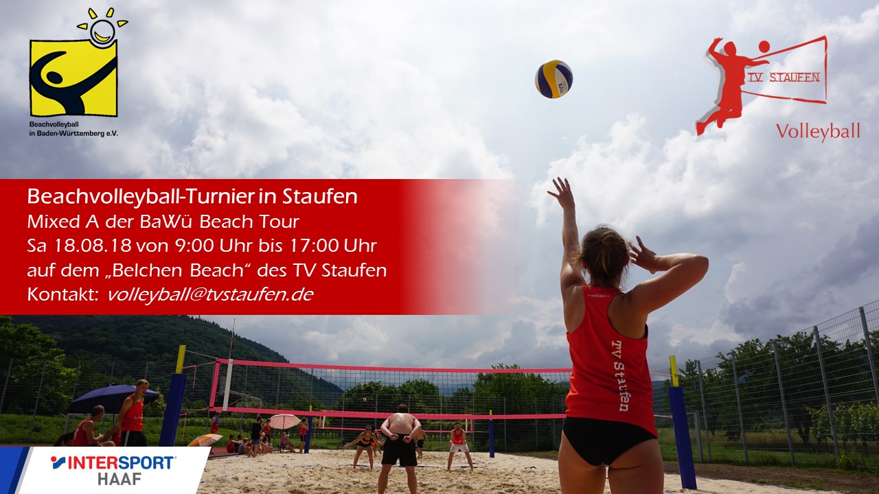 Am Samstag 18. August 2018 lädt der TV Staufen recht herzlich zum letzten Mixed A der BaWü Beachtour ein. Es ist gleichzeitig das erste offizielle Beachvolleyball-Turnier auf der neuen Beachvolleyball-Anlage „Belchen Beach“. Der Belchen Beach zeichnet sich durch hervorragenden Sand und eine schöne Lage mit Aussicht auf den Belchen aus. Außerdem ist die Anlage nur 200 Meter vom Bahnhof Staufen Süd entfernt (30 min von Freiburg Hbf.). Das Turnier wird freundlicherweise von INTERSPORT HAAF gesponsert, sodass sich die Teilnehmer auf attraktive Preise freuen können.
